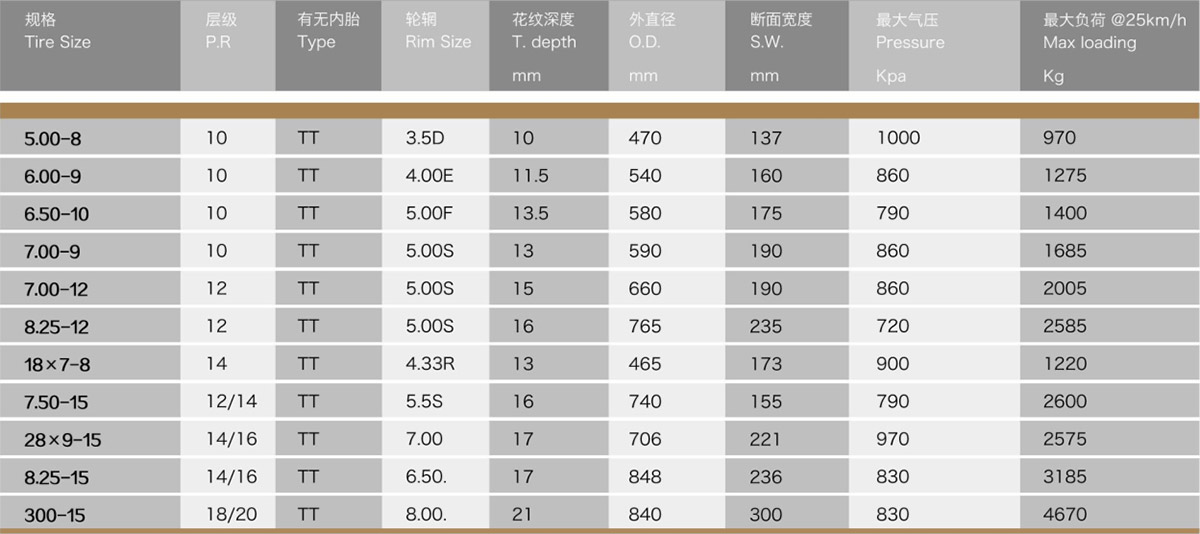 适用于铲运车、叉车,在港口、工厂、仓库等环境下作业具有良好的抗切割、耐磨损性能,宽厚的胎面花纹,提供了良好的接地及牵引性能,自洁性好,寿命长。